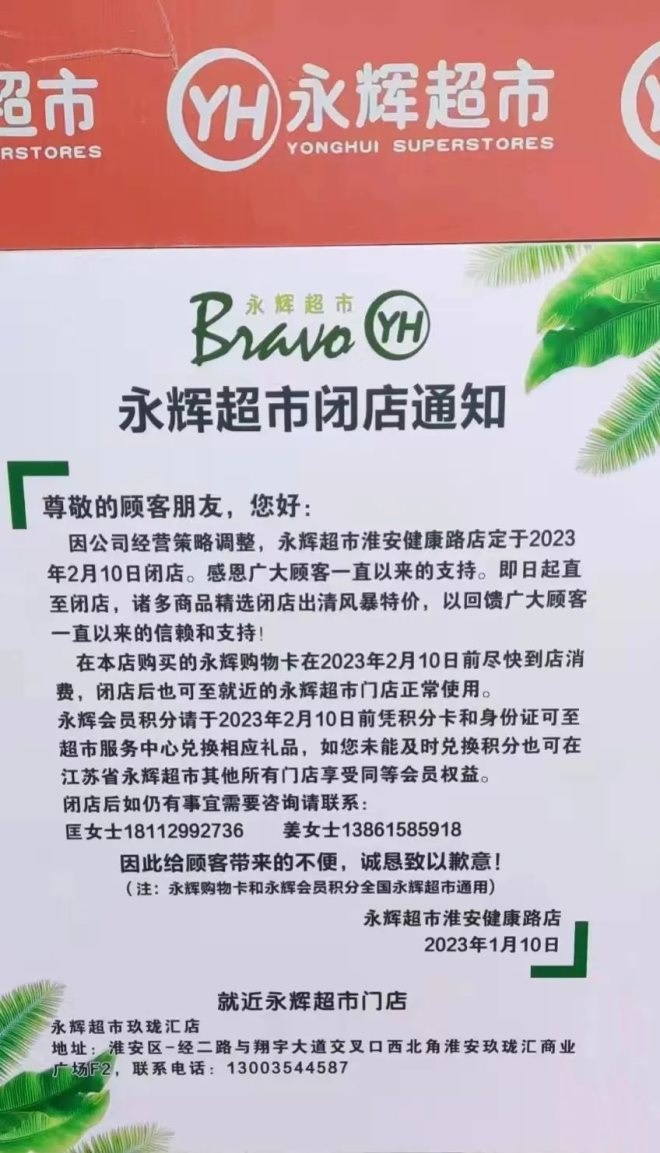 聯(lián)商快訊:因經(jīng)營(yíng)策略調(diào)整,永輝超市淮安健康路店將于2023年2月10日正式閉店。