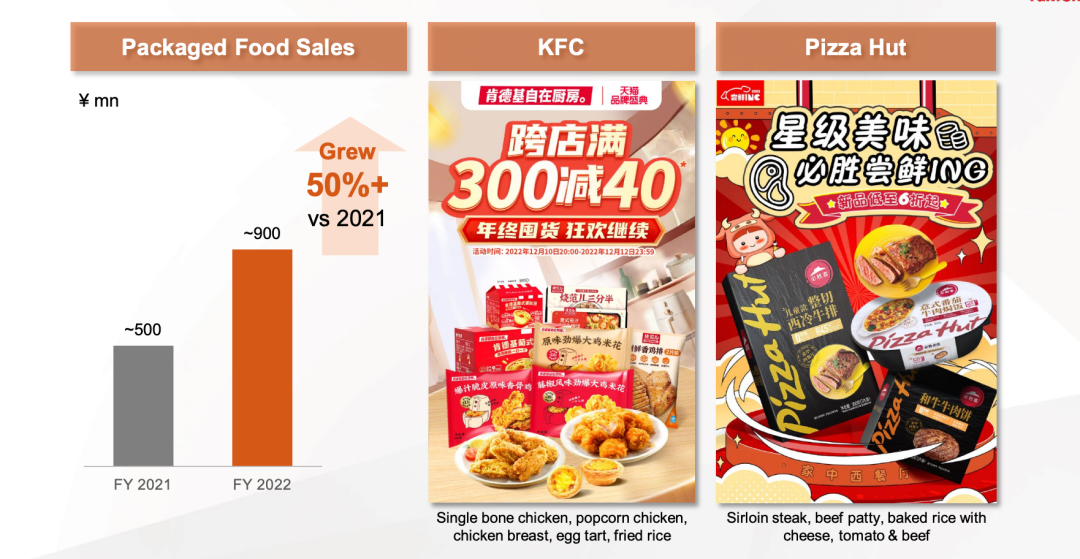 肯德基和必勝客的另一個收入增長點來自包裝食品銷售,如“肯德基自在廚房”系列,必勝客的整切西冷牛排、和牛牛肉餅等產(chǎn)品。這項業(yè)務(wù)迎合了消費(fèi)者居家用餐的需求,公司資料顯示,包裝食品的銷售較2021年實現(xiàn)了50%的增長。