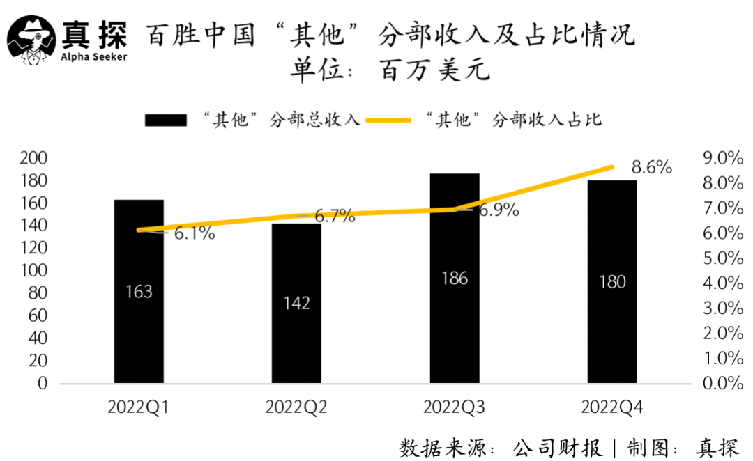 財報顯示,2022年第四季度,“其他”分部實現(xiàn)總收入1.8億美元,占公司總收入的比例為8.6%,占比呈現(xiàn)上升趨勢。在利潤和擴(kuò)張方面,“其他”分部的表現(xiàn)相對遜色。財報顯示,四季度,百勝中國“所有其他分部”的經(jīng)營虧損為1100千萬美元。截至2022年年末,“其他”分部共有門店950家,較2021年年末的1030家有所下滑。