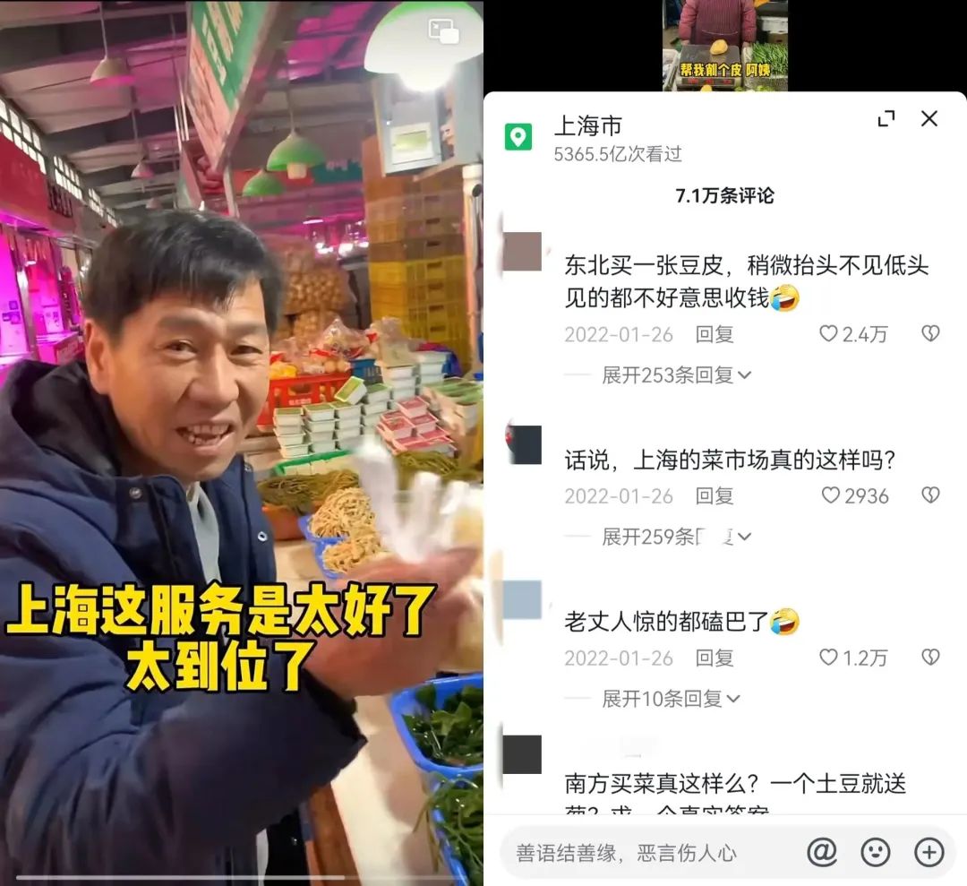 直到1月26日,南方女婿帶東北老丈人去南方菜場(chǎng)買菜,老丈人見(jiàn)只買了一張豆皮,老板還幫忙切成絲后發(fā)出驚嘆:“還幫你切成絲?不如直接幫你炒了得了,這服務(wù)也太到位了!”