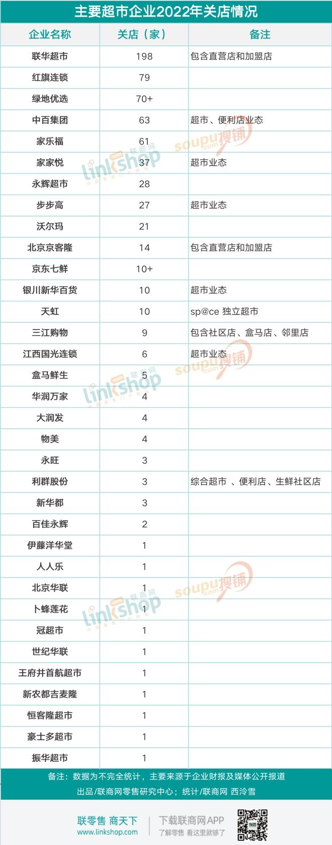據(jù)聯(lián)商網(wǎng)零售研究中心不完全統(tǒng)計,聯(lián)華超市、紅旗連鎖、永輝超市、中百集團、綠地優(yōu)選、京東七鮮等34家超市企業(yè)2022年關(guān)閉門店超過680家。