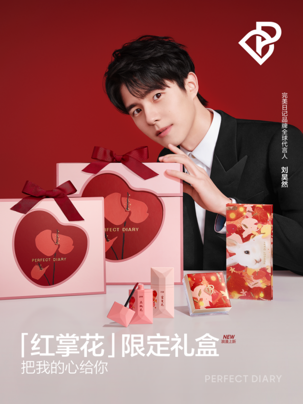 完美日記也攜手品牌全球代言人劉昊然,推出「紅掌花」限定禮盒,將紅掌花與心形象結(jié)合,精心打造紅掌花心形設(shè)計(jì)禮盒,愛心的套盒外形搭配濃郁鮮艷的花瓣顏色,借助“燃燒的心熱情似火”花語,展現(xiàn)出戀人之間炙熱如初的濃烈愛意。