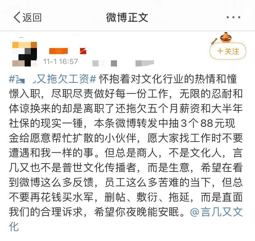 門店方面的收縮只是企業(yè)困境的縮影。2021年下半年起,言幾又欠薪、拖欠供應(yīng)商貨款事件開始發(fā)酵。2021年底,央視財(cái)經(jīng)播出《網(wǎng)紅書店困局》節(jié)目,報(bào)道了言幾又欠薪、不給員工交社保、多家門店關(guān)閉等情況,向公眾展示了言幾又所面臨的艱難處境。