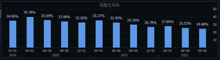 不難看出,保利發(fā)展利潤端下滑速度要明顯快于收入端,背后原因在于毛利率的下滑。數(shù)據(jù)顯示,2022年前三季度,保利發(fā)展銷售毛利率為24.48%,較2021年全年毛利率水平(26.78%)下滑3.4個百分點。