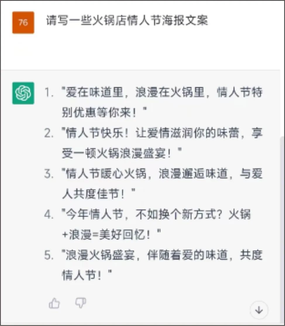 而ChatGPT就是一個“生成式AI”,所以它可以完成一些基礎(chǔ)品宣文案方面的內(nèi)容,比如火鍋餐見就讓其寫了一些火鍋店情人節(jié)海報文案。