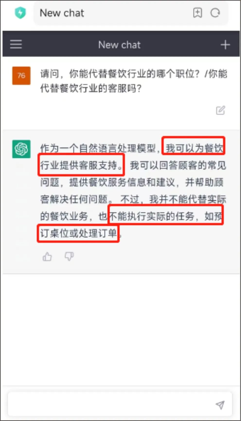 同時它在后半部分補(bǔ)充的半句話,“不能代替實際的餐飲業(yè)務(wù),如預(yù)訂桌位或處理訂單”,讓人有超預(yù)期的驚喜,它比想象中更智能、聰明,想必在對話中也會更加靈活多變。