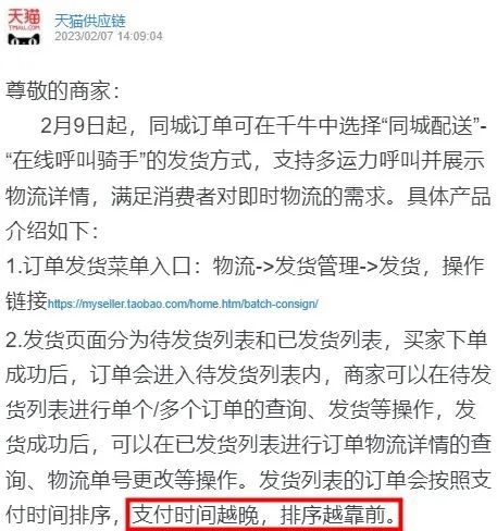 根據(jù)天貓供應(yīng)鏈在千牛平臺(tái)最新發(fā)布的通知,從今日起,千牛工作臺(tái)新增同城配送發(fā)貨方式。