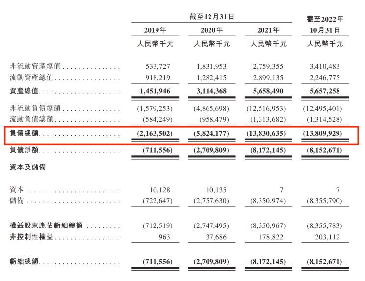 據(jù)招股說明書顯示,截止2022年10月31日,KK集團(tuán)按公平值計(jì)入損益的金融負(fù)債總額已經(jīng)達(dá)到人民幣107億元。