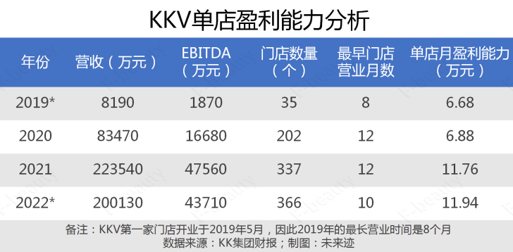 除了THE COLORIST(調(diào)色師),從財(cái)務(wù)數(shù)據(jù)上看,KKV的單店盈利能力則要更強(qiáng)!段磥碹EFuture Beauty》根據(jù)KK集團(tuán)的財(cái)務(wù)報(bào)表計(jì)算發(fā)現(xiàn),其單店月均EBITDA居于6萬元到11萬元之間,和同類型門店名創(chuàng)優(yōu)品相比要高出不少。