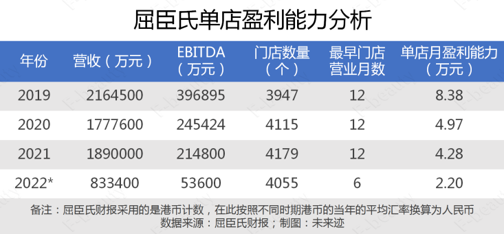 根據(jù)《未來跡Future Beauty》的了解,這一數(shù)據(jù)在大型連鎖美妝零售店中已經(jīng)是比較優(yōu)秀的水平。一個(gè)可與之對(duì)比的對(duì)象是大型線下美妝零售連鎖屈臣氏,根據(jù)其中國區(qū)的財(cái)務(wù)數(shù)據(jù)計(jì)算發(fā)現(xiàn),屈臣氏在大陸市場的單店月均EBITDA在4萬元左右。