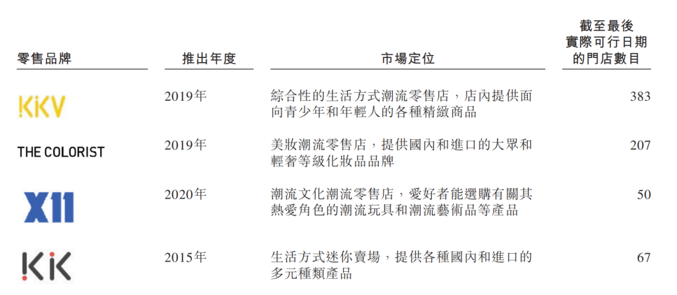 招股說明書顯示,KK集團(tuán)定位為“潮流零售商”,以為Z世代年輕消費(fèi)者提供優(yōu)質(zhì)的時(shí)尚潮流商品,讓美好生活無邊界為使命。目前旗下共有綜合性生活方式潮流零售店KKV;美妝潮流零售店THE COLORIST(調(diào)色師);潮流文化零售店X11以及生活方式迷你賣場KK四種類型的線下零售店,截止2022年10月31日在全球總共有701家門店,其中的556家為自有直營店鋪。