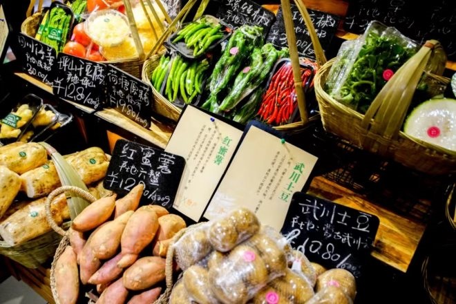 在這里,消費(fèi)者總能發(fā)現(xiàn)其他地方買(mǎi)不到的果蔬。這是因?yàn)椋冒倏蜕釛壛耸忻嫔铣R?jiàn)的品牌,而是選擇了當(dāng)季、本地以及個(gè)性化的果蔬產(chǎn)品,在食品館的果蔬區(qū)入口位置可以看到當(dāng)季推薦食材的海報(bào),培養(yǎng)客人“食在當(dāng)季”的飲食習(xí)慣。
