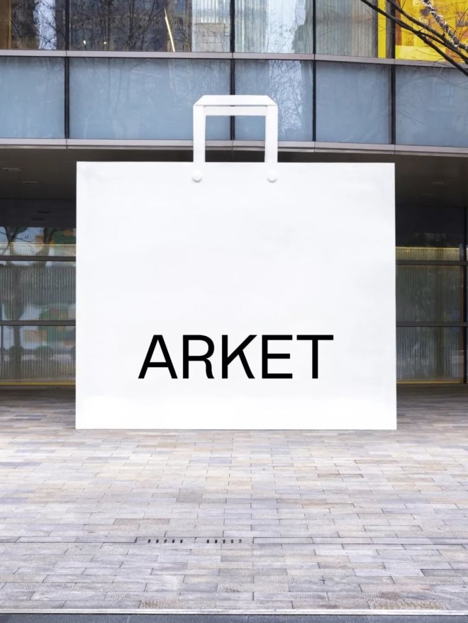 首店沿街而立,分為上下兩層,整整700平方,門店擺放著以標(biāo)志性ARKET購(gòu)物袋為靈感的巨型裝置。