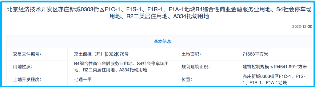 根據(jù)北京市規(guī)劃和自然資源委員會公示的信息,北京越新房地產(chǎn)開發(fā)有限公司于2月7日以31.12億元競得北京亦莊一塊71668平方米的土地。