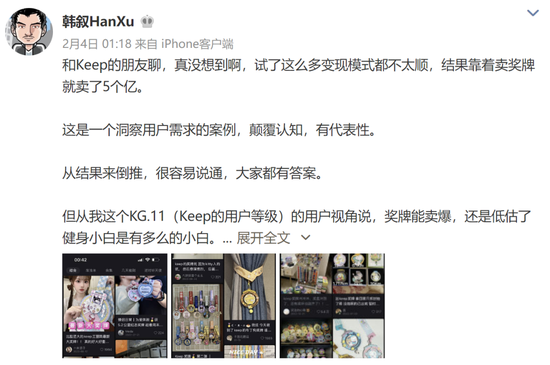 業(yè)內(nèi)人士韓敘的一張微博截圖改變了外界對(duì)keep對(duì)獎(jiǎng)牌的認(rèn)知。
