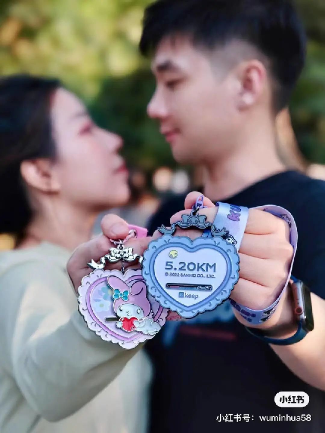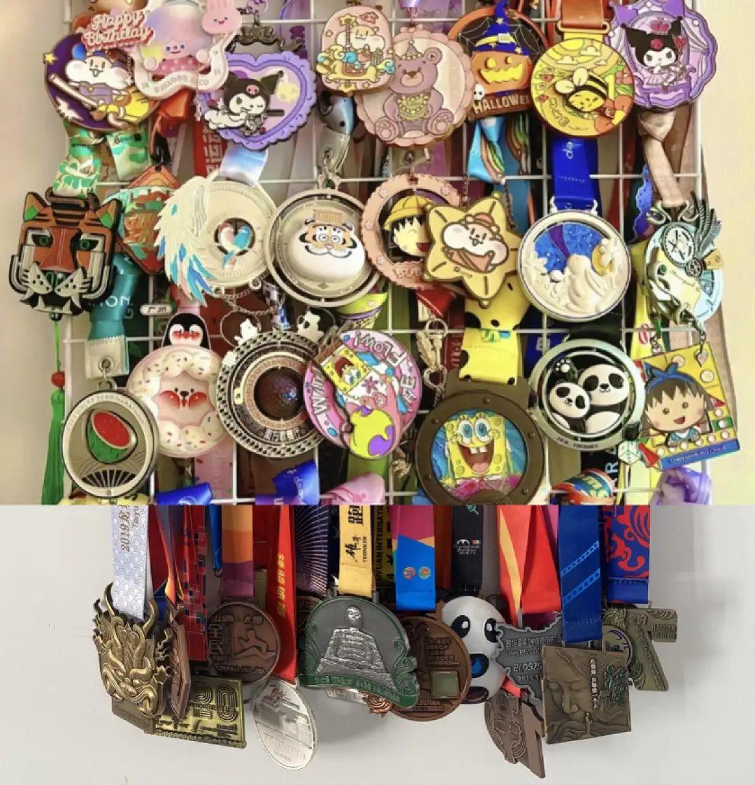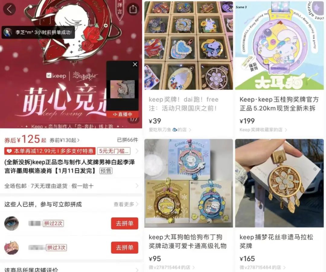 獎(jiǎng)牌來(lái)自Keep的線上賽事活動(dòng),牌面上不僅有風(fēng)靡萬(wàn)千少女心尖的庫(kù)洛米和大耳狗,還有限量出現(xiàn)的《戀與制作人》,甚至連電子榨菜頭號(hào)選手《甄嬛傳》都在其中;設(shè)計(jì)上也有點(diǎn)意思,鏤空、旋轉(zhuǎn)、小鏡子……乍一眼真的和泡泡瑪特很像,只不過(guò)一個(gè)的娃娃是站著,一個(gè)的“頭”上掛著條繩。