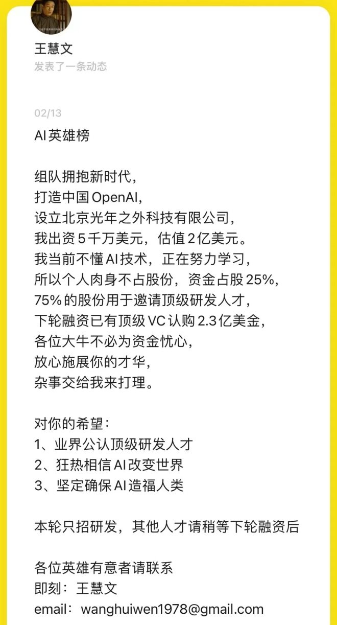 據(jù)悉,王慧文發(fā)布的招聘信息顯示,其設(shè)立北京光年之外科技有限公司,“要打造中國OpenAl,其個(gè)人出資5000萬美元,估值2億美元。個(gè)人不占股份,自有資金占股25%,剩余75%的股份用于邀請頂級研發(fā)人才!