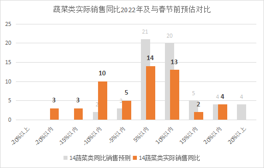 16、蔬菜類(葉菜類、根莖類、瓜類與茄果類、菌菇類、花菜、芽苗、豆類、腌漬加工蔬菜、其他蔬菜)的大部分企業(yè)表現(xiàn)較為平穩(wěn),銷售同比2022年增長15-20%的有4家,增長10-15%的有2家,增長5-10%的有13家,增長5%以內(nèi)的有14家,有21家同比下降。下跌的企業(yè)中有受人員返鄉(xiāng)、物流、備貨、重視程度、自營能力等因素影響較多。
