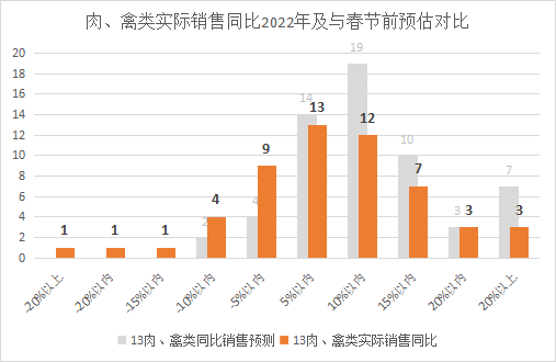 肉禽類今年春節(jié)銷售整體好于去年,主要原因是在家做飯影響主要食材銷售增長。預(yù)期差距較大的企業(yè)主要是因為價格低導(dǎo)致銷售額下降或其他渠道分流等影響。