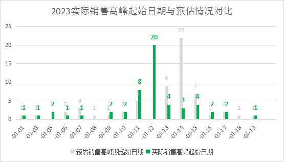 大多數(shù)樣本企業(yè)從1月11日、12日(農(nóng)歷臘月二十、二十一)直接進入銷售高峰,防控政策調(diào)整加之楊康之后喜迎新春的期望作出了快速的反應(yīng),早點回家團員、心之所向,因此高峰較往年提前兩天(2022年高峰出現(xiàn)在臘月二十三)。