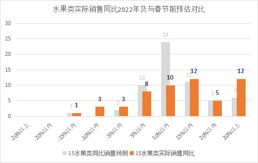 1、水果類(蘋果、梨、桃李杏、柑橘、瓜果、漿果、熱帶類、堅果類、其他水果、水果禮盒)的表現(xiàn)優(yōu)秀,銷售同比2022年增長20%以上的有12家,增長15-20%的有5家,增長10-15%的有12家,增長5-10%的有10家,增長5%以內(nèi)的有8家,僅有7家同比下降。