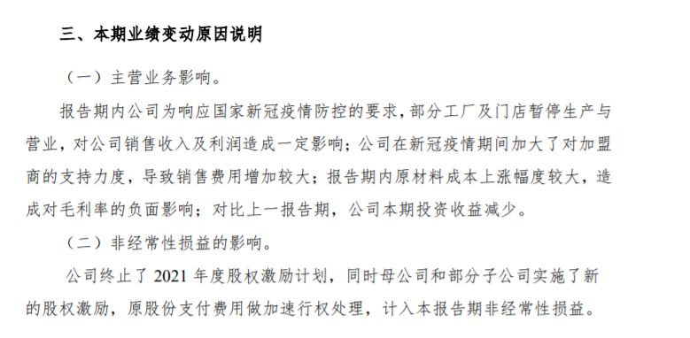 一是疫情防控政策的影響,導致部分工廠和門店生產(chǎn)經(jīng)營的暫停,對營收和利潤造成不利影響。