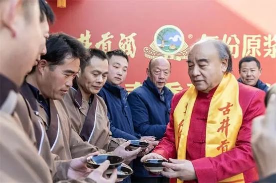 圖說(shuō):梁金輝與釀酒人員共飲春釀?lì)^酒 圖源:古井集團(tuán)官網(wǎng)