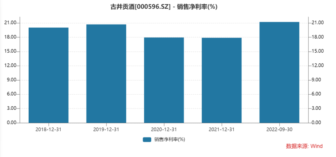 營(yíng)銷(xiāo)費(fèi)用高企,也導(dǎo)致古井貢酒凈利率下降。2019年至2021年,古井貢酒的凈利率分別為20.71%、17.95%和17.89%,不斷下滑。2022年前三季度,這一指標(biāo)才實(shí)現(xiàn)回升,升至21.22%。不過(guò)據(jù)長(zhǎng)江證券研報(bào),同期國(guó)內(nèi)白酒行業(yè)凈利率為39%。