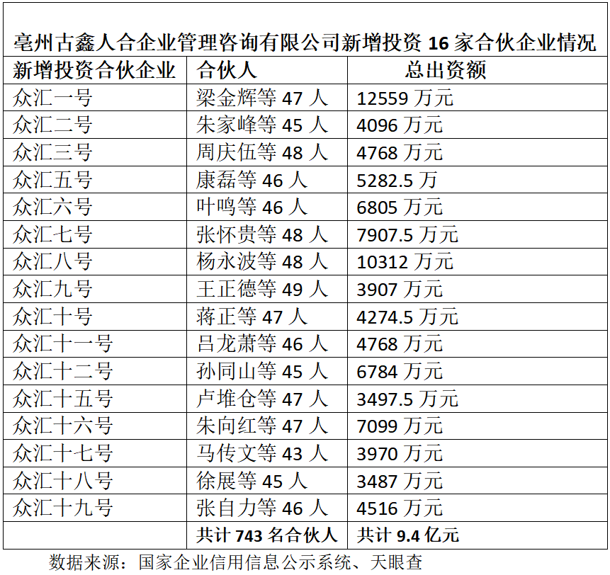 時(shí)代周報(bào)記者從國(guó)家企業(yè)信用信息公示系統(tǒng)及天眼查了解到,2023年2月初,古鑫人合對(duì)外投資成立了16家合伙企業(yè),分別為亳州眾匯一號(hào)企業(yè)管理合伙企業(yè)(有限合伙)(下稱(chēng)“眾匯一號(hào)”)、眾匯二號(hào)、眾匯三號(hào)、眾匯五號(hào)、眾匯六號(hào)、眾匯七號(hào)、眾匯八號(hào)、眾匯九號(hào)、眾匯十號(hào)、眾匯十一號(hào)、眾匯十二號(hào)、眾匯十五號(hào)、眾匯十六號(hào)、眾匯十七號(hào)、眾匯十八號(hào)、眾匯十九號(hào),共計(jì)743名股東(包括企業(yè)股東)。