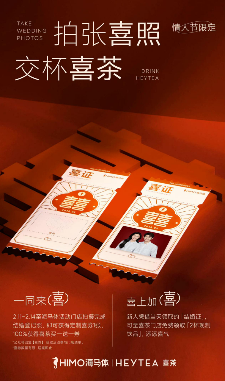 據(jù)了解,2月11日-2 月14日,新人到海馬體活動門店拍攝完成結婚登記照,即可獲得定制喜券1張,同時憑借當天領取的結婚證到喜茶門店可免費領取「2杯現(xiàn)制飲品」。另外,2月14日到喜茶下單任意2杯現(xiàn)制飲品,即可獲得「喜證」2張。此外,深圳卓悅匯的喜茶門店將限時變身全國唯一「喜氣照相館」,海馬體攝影師屆時將駐場拍「喜照」。