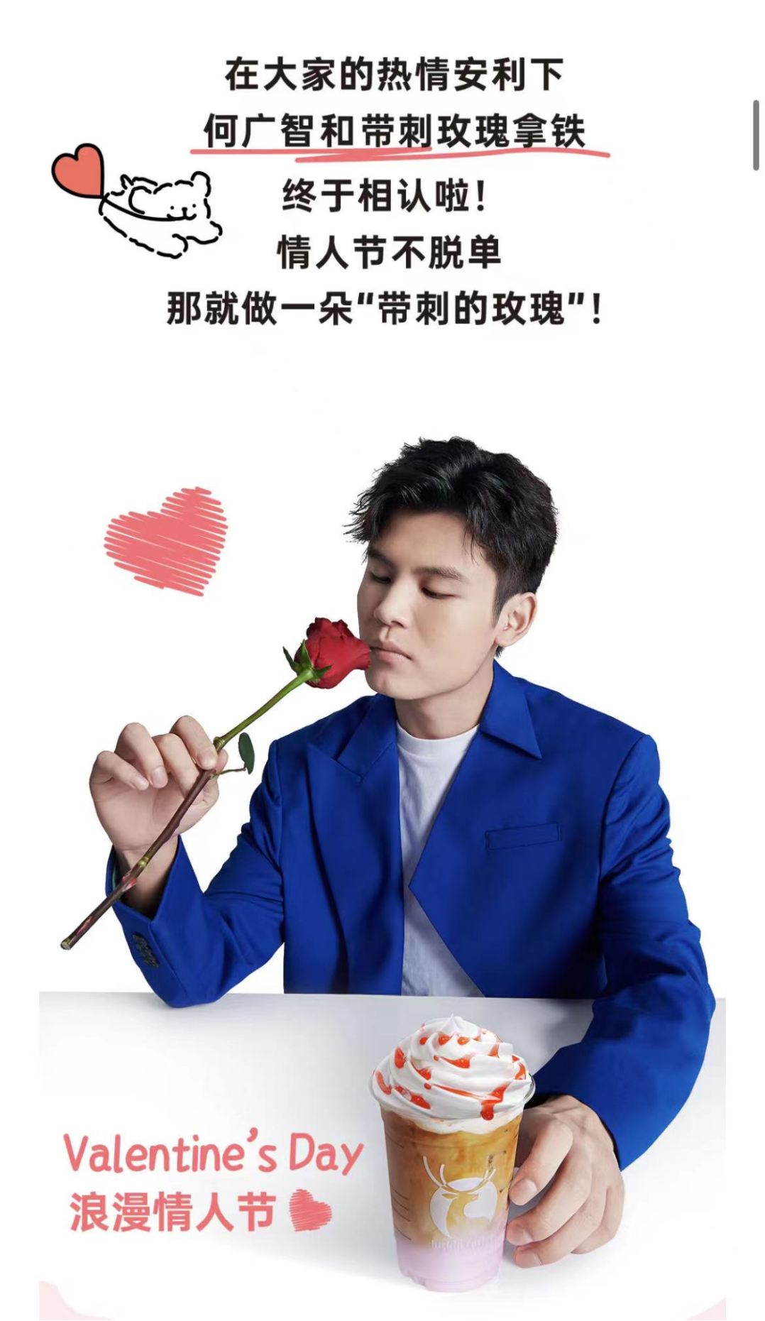 你以為這就結束了?就在情人節(jié)前一天,瑞幸官宣帶刺玫瑰何廣智和帶刺玫瑰拿鐵相認了,“帶刺玫瑰沒有刺,只有修狗和廣智”,“情人節(jié)不脫單,那就做一朵帶刺的玫瑰”,“愛紅豆的「甜狗」才是情人節(jié)之光”,這文案功底可謂是將《脫口秀大會》的熱門段子和網(wǎng)絡熱梗都給拿捏住了,不愧是玩梗大師。