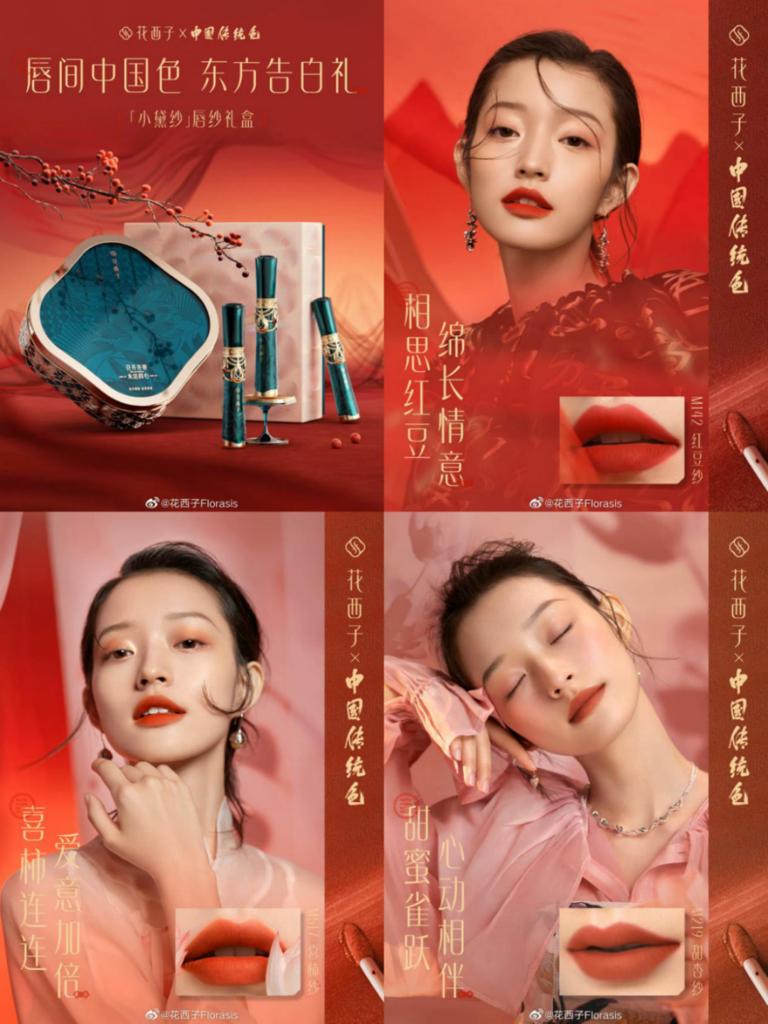 在今年的情人節(jié)期間,主打東方彩妝品牌花西子結合自家品牌定位和中國市場特點推出紅豆紗、喜柿紗、甜杏紗、洛神珠、海天霞等「中國色」唇紗,不僅為西方的情人節(jié)增添中國色彩,也在一眾主打愛情、浪漫主題的品牌中別具一格。
