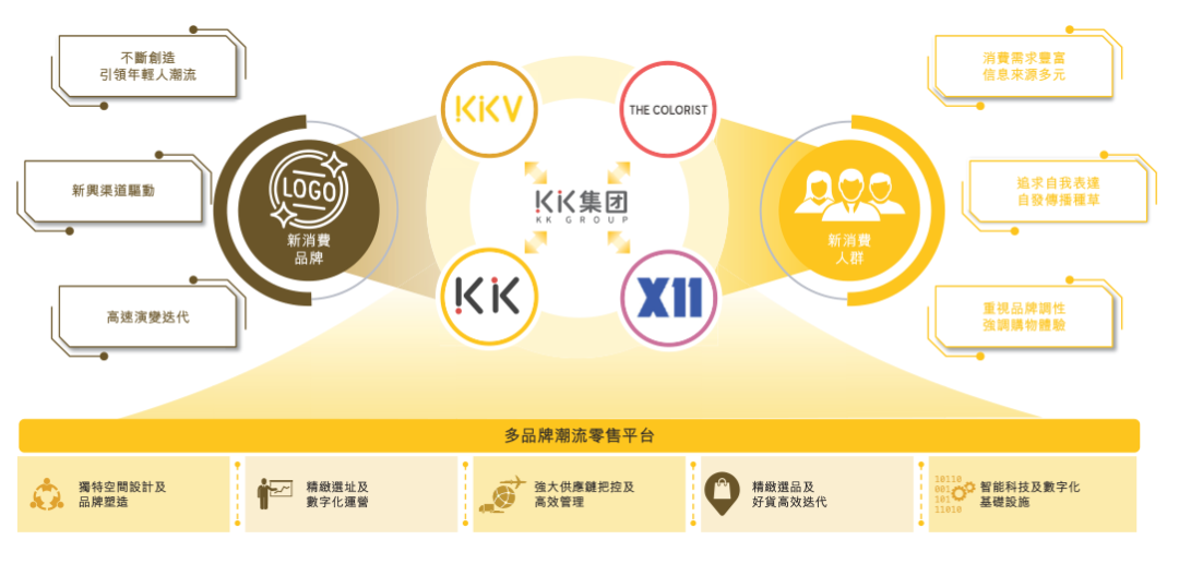 2019年和2020年,KK集團(tuán)陸續(xù)推出KKV、THE COLORIST以及X11,分別定位于綜合性的生活方式潮流零售店、美妝潮流零售店、潮流文化潮流零售店。商品種類涵蓋美妝、潮玩、食品飲料、家居品及文具等。