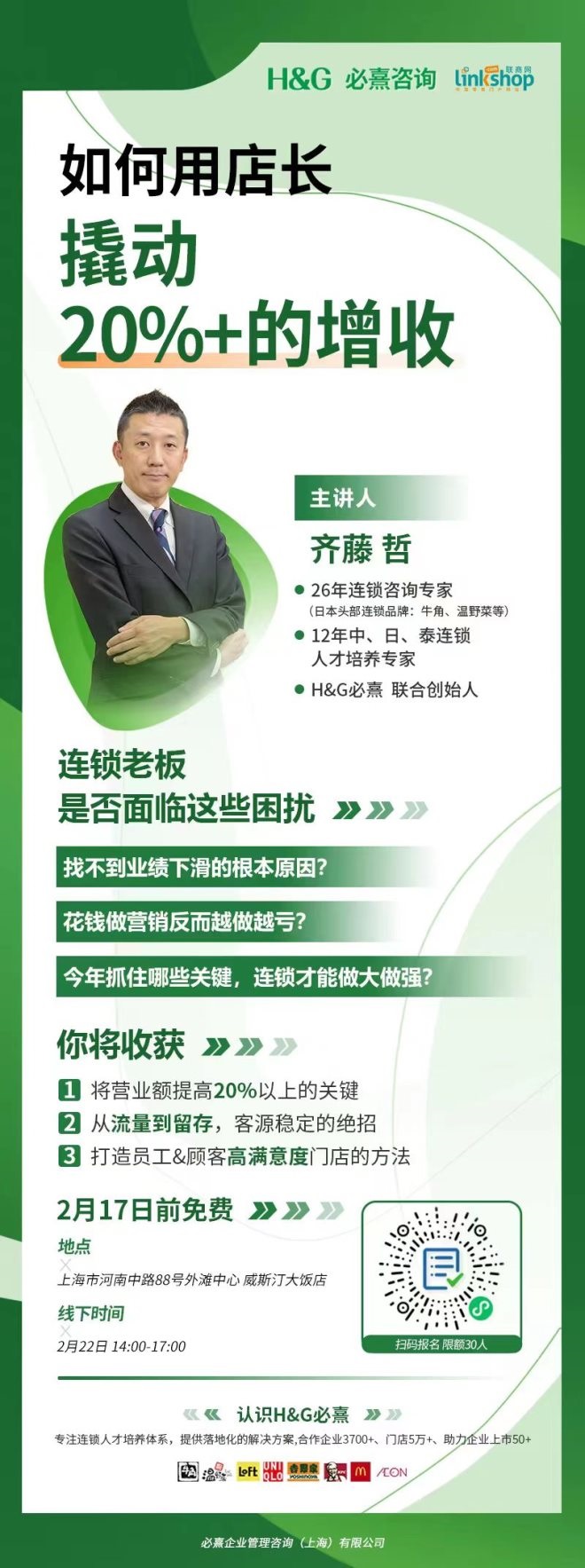 如果你現(xiàn)在處于業(yè)績(jī)瓶頸、想要加速擴(kuò)張,那么,2月22日推薦大家一定要來(lái)參加這場(chǎng)線(xiàn)下宣講會(huì),面對(duì)面來(lái)探討一下,如何用店長(zhǎng)來(lái)撬動(dòng)20%+的營(yíng)業(yè)額增長(zhǎng)。