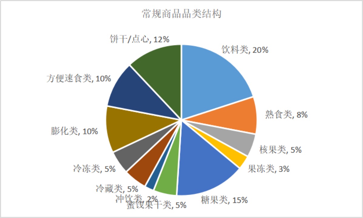 大類方面,零食店一般分為散稱商品和常規(guī)商品,兩者商品數(shù)各占50%左右。下一級分類中,各分類商品數(shù)參考如下: