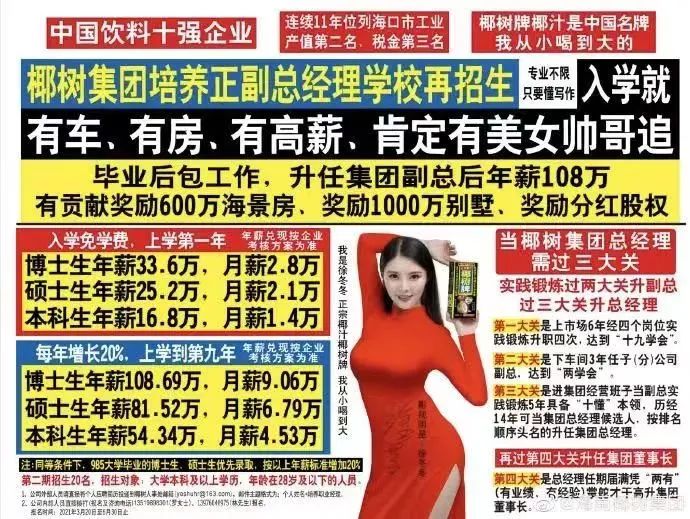 2021年3月25日,沉寂一段時間的椰樹集團(tuán)發(fā)布招聘廣告,“有車有房有高薪,肯定有美女帥哥追”的說辭,迎來了海南省市場監(jiān)管局的行政約談,共計罰款40萬元。
