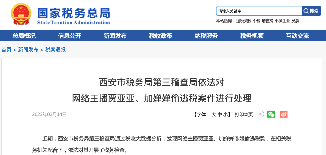 2月14日消息,西安市稅務局第三稽查局此前通過稅收大數(shù)據(jù)分析,發(fā)現(xiàn)網(wǎng)絡主播賈亞亞、加嬋嬋涉嫌偷逃稅款,在相關稅務機關配合下,依法對其開展了稅務檢查。