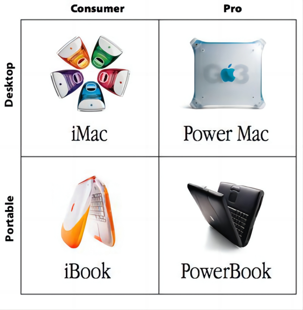 喬布斯提出2×2產(chǎn)品網(wǎng)格,以簡(jiǎn)化當(dāng)時(shí)臃腫的產(chǎn)品線。圖源:MacRumors官網(wǎng)