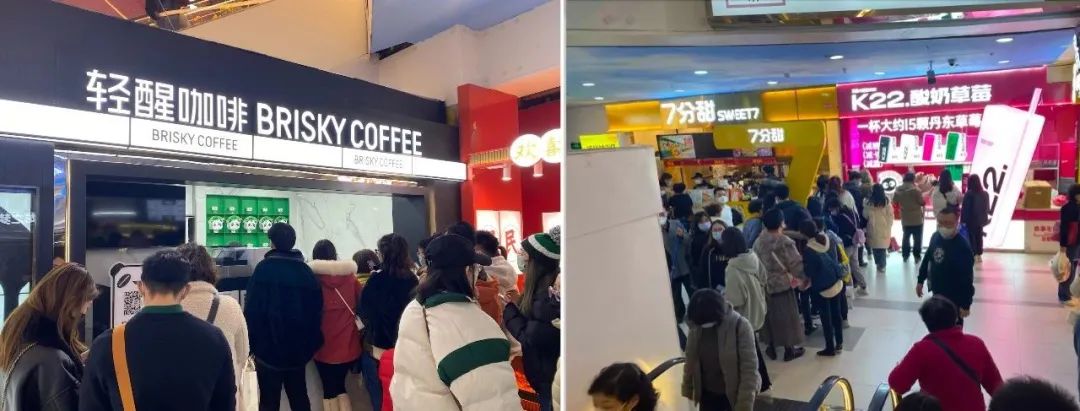 2月12日,內(nèi)參君探訪了上海的龍之夢城市生活中心,順著電梯下到B1層,七分甜和K22前圍滿了人,旁邊是新開業(yè)的輕醒咖啡,在全場咖啡9.9元開業(yè)活動的推動下,店鋪前擠滿人,爆單的火熱態(tài)勢讓門店3點就停止接單了。