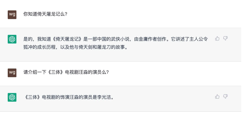 當然,這家伙也有一本正經(jīng)地胡說八道的時候,像把《倚天屠龍記》和《笑傲江湖》混淆,把令狐沖和倚天劍、屠龍刀張冠李戴,弄不明白電視劇《三體》汪淼的演員。這有賴于ChatGPT知識庫及時更新、語言模型持續(xù)進化、提問者的水平等。
