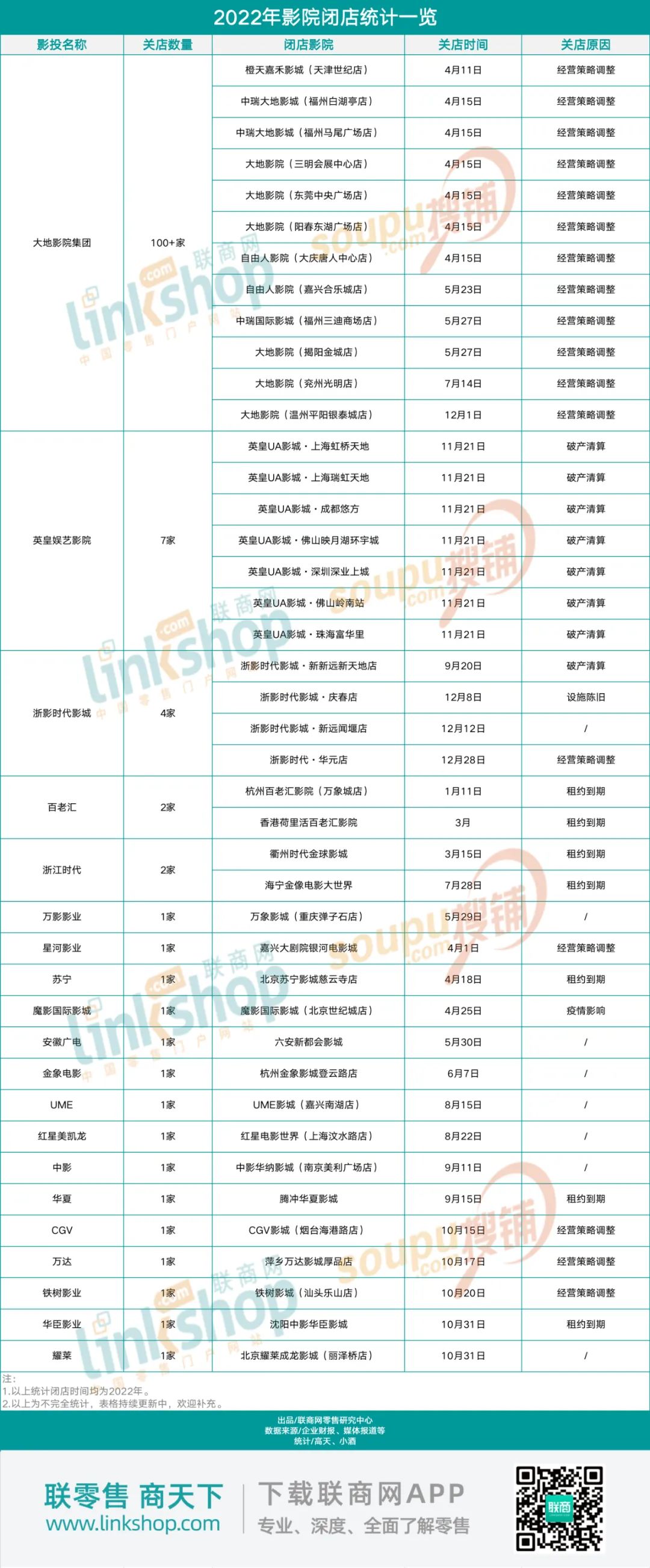 過去三年疫情中,影院艱難求生。據(jù)聯(lián)商網(wǎng)零售研究中心不完全統(tǒng)計,2022年全國至少有130家影院告別市場。其中,大地影院集團關(guān)閉影院數(shù)量達(dá)到100多家,包括大地影院、橙天嘉禾、自由人影城、中瑞國際等品牌在內(nèi),占比約77%。