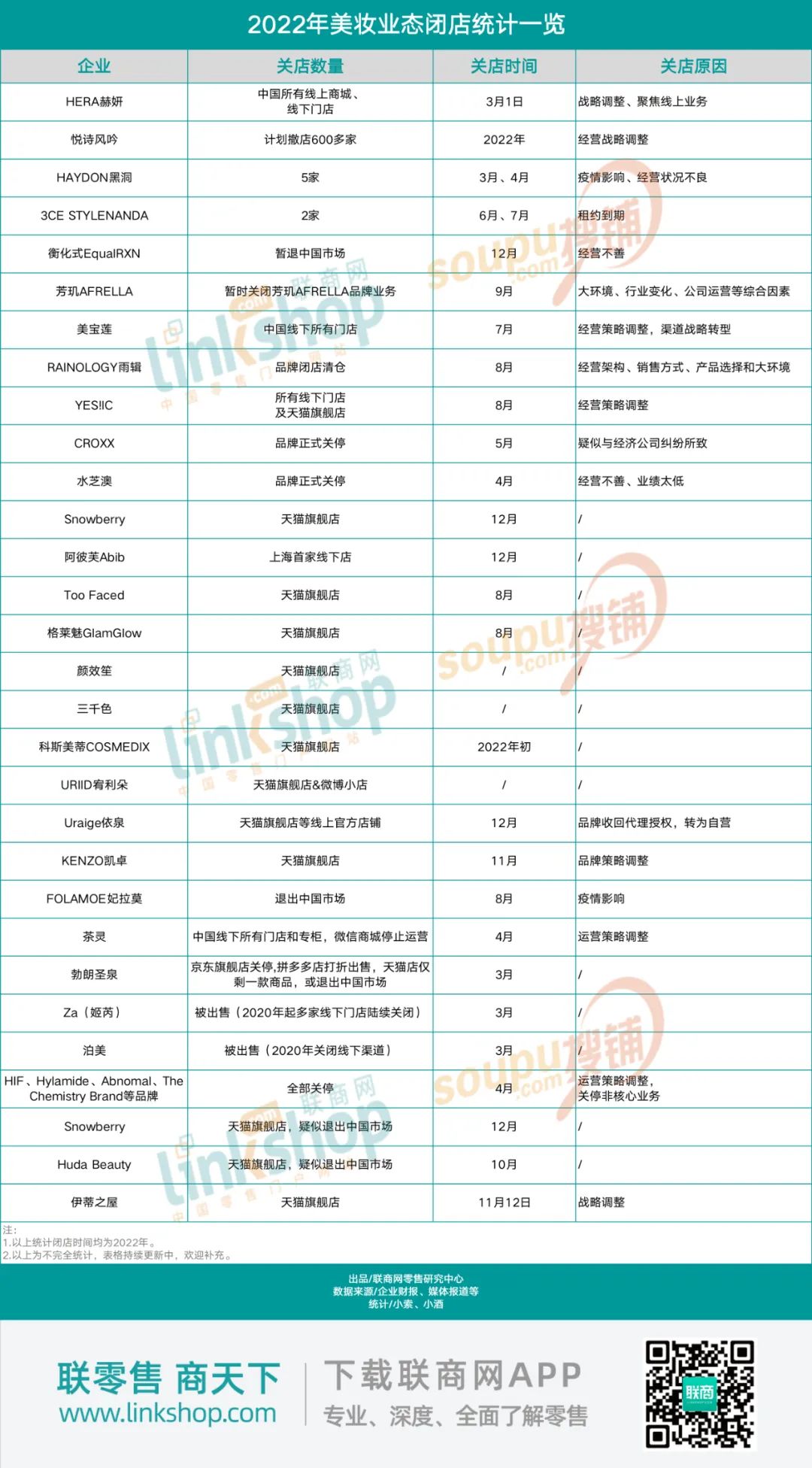 據(jù)聯(lián)商網(wǎng)零售研究中心不完全統(tǒng)計,2022年美妝業(yè)態(tài)至少有31家品牌、600多家店關(guān)閉。在這其中,有不少品牌是由于退市而閉店,關(guān)閉的品牌中既包括外國品牌退出中國市場,也有本土品牌正式關(guān)停。