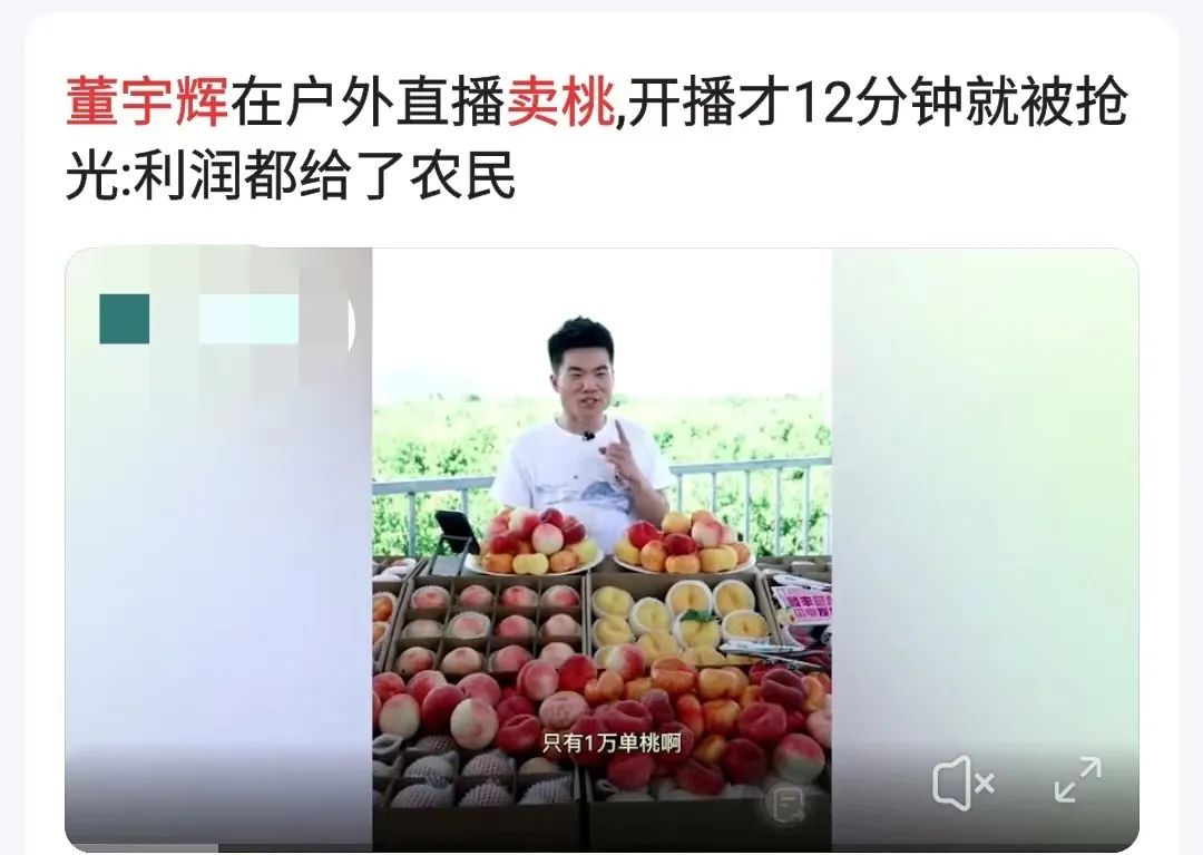 半小時內(nèi),直播間同時在線觀看人數(shù)一度高達(dá)30萬。十幾分鐘內(nèi),賣出了1萬單桃子,董宇輝還表示,公司沒賺什么錢,賣桃子的利潤幾乎所有都給了農(nóng)民。