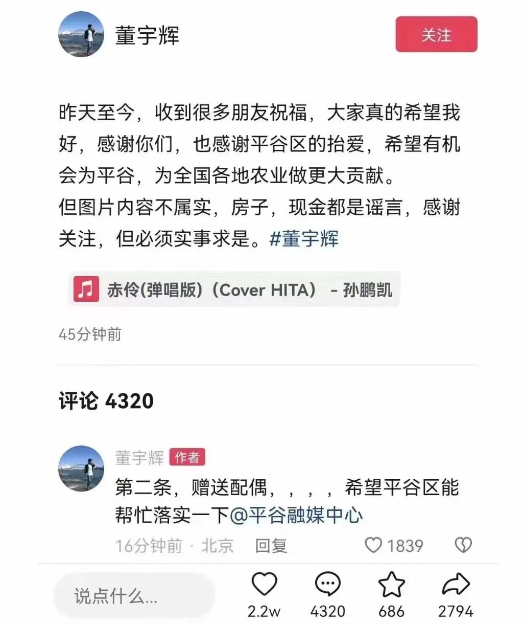 董宇輝在回應(yīng)中還調(diào)皮地表示,希望平谷區(qū)政府能落實一下“贈送配偶”獎勵。