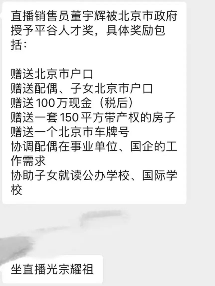但沒多久,平谷區(qū)對新京報澄清,網(wǎng)絡(luò)截圖中說的100萬現(xiàn)金和150平米的房子是給“突出貢獻(xiàn)人才”的獲得者,而董宇輝獲得的表彰是“深耕厚植”獎,并非“突出貢獻(xiàn)人才”。