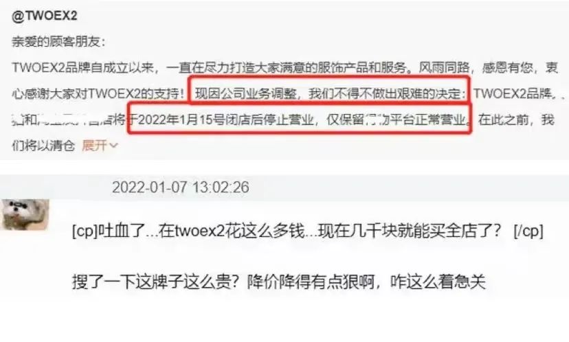 黃明昊個(gè)人潮牌“TWDEX2”運(yùn)營(yíng)不到兩年,就關(guān)閉天貓、淘寶和抖音店鋪,并順便搞起了清倉(cāng)大甩賣,原本一件售價(jià)1899元的鏤空西裝,699元的長(zhǎng)袖T恤,紛紛降至99元、129元等低價(jià)處理,不少高位入手的網(wǎng)友吐槽自己成了“大冤種”。
