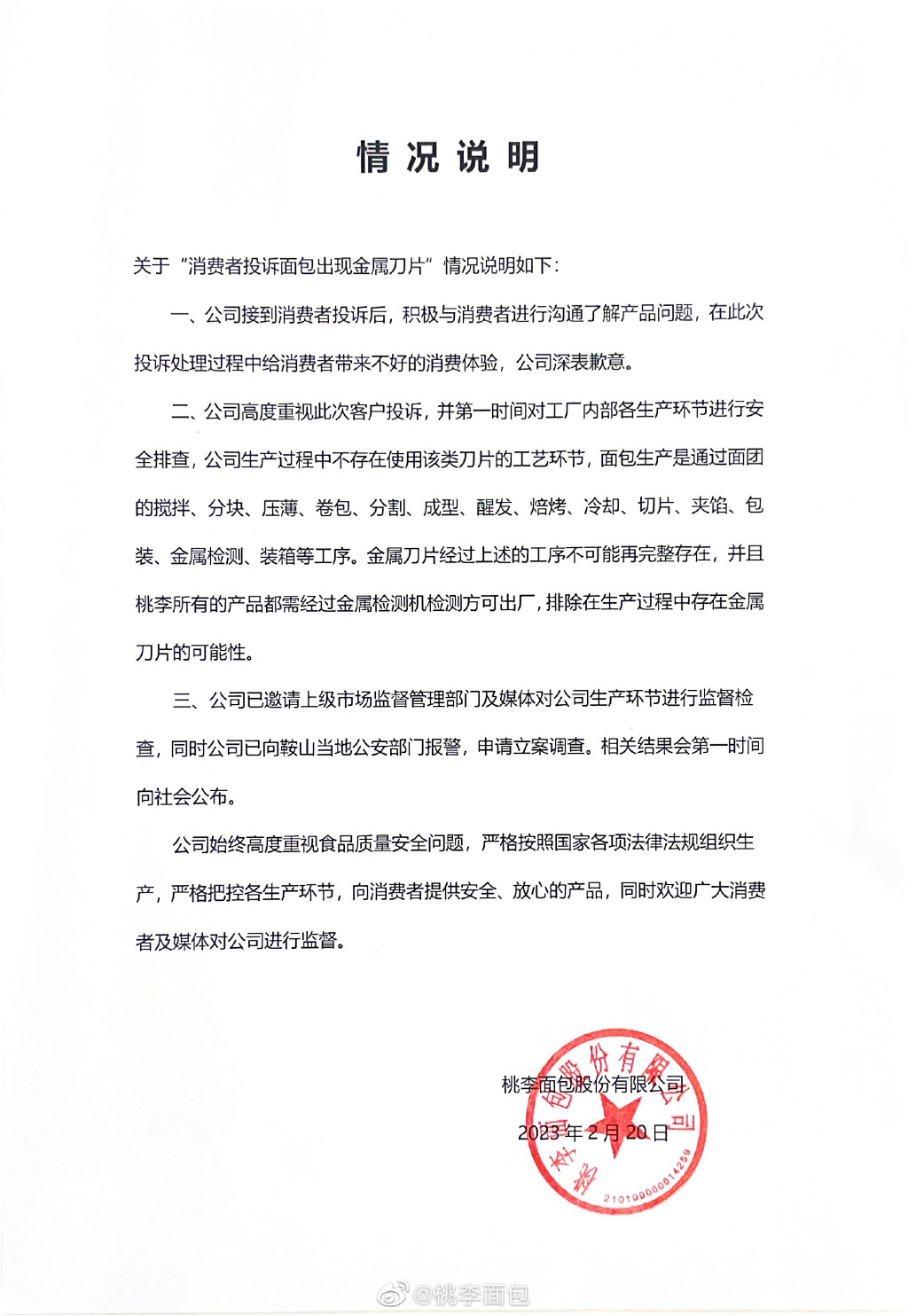 聯(lián)商快訊:2月20日,桃李面包就“消費者在面包中吃出帶銹刀片”一事發(fā)布情況說明。