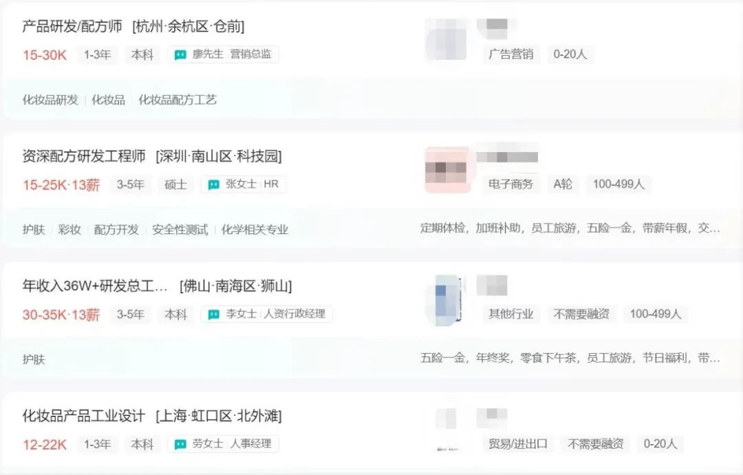 國貨美妝開始“卷”研發(fā)已成為當(dāng)下一大共識,從開年以來各個(gè)化妝品企業(yè)的招聘情況就可見一斑。近期青眼在各招聘軟件上看到,不少公司就在招聘化妝品研發(fā)工程師、配方師等崗位,其中不乏部分知名品牌和新銳品牌等。從薪資水平上來看,研發(fā)工程師的月薪普遍在1萬元至3萬元左右,也有部分公司的月薪高達(dá)3.5萬元。