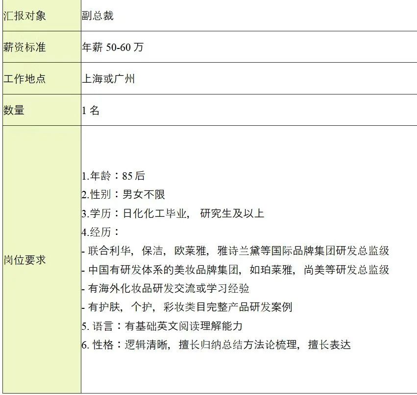 值得關(guān)注的是,一位業(yè)內(nèi)知情人士向青眼透露,近期上海某化妝品公司正在招聘產(chǎn)研總監(jiān),并開出了50-60萬元的年薪。根據(jù)該公司的招聘信息顯示,其崗位要求中尤其指出了應(yīng)聘者需要有“聯(lián)合利華,寶潔,歐萊雅,雅詩蘭黛等國際品牌集團(tuán)研發(fā)總監(jiān)級”“中國有研發(fā)體系的美妝品牌集團(tuán),如珀萊雅等研發(fā)總監(jiān)級”以及“有海外化妝品研發(fā)交流或?qū)W習(xí)經(jīng)驗(yàn)”等,并對英語能力也提出了要求。