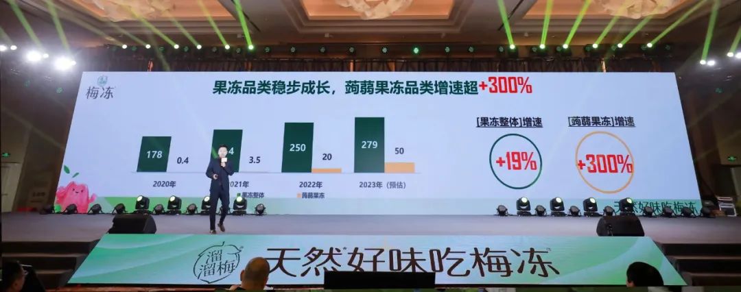 溜溜果園CBO梅惠祥介紹,2020年至2022年,果凍市場(chǎng)的規(guī)模約為178億元、214元和250億元,2023年預(yù)估為279億元,而蒟蒻果凍的份額將從2020年的4000萬元、2021年3.5億元、2022年的20億元,年復(fù)合增長(zhǎng)率超過300%,2023年則有望提升至50億元。